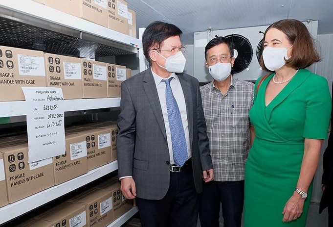 Đại sứ Australia Robyn Mudie cùng Thứ trưởng Bộ Y tế Trương Quốc Cường thăm kho lưu trữ vaccine tại Viện Vệ sinh Dịch tễ Trung ương.